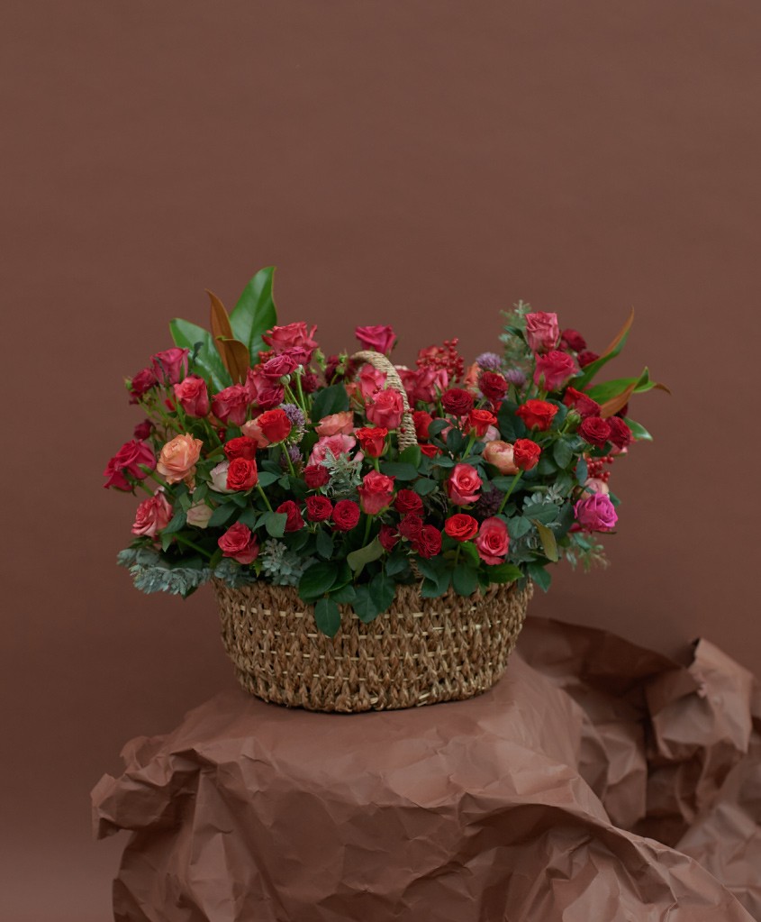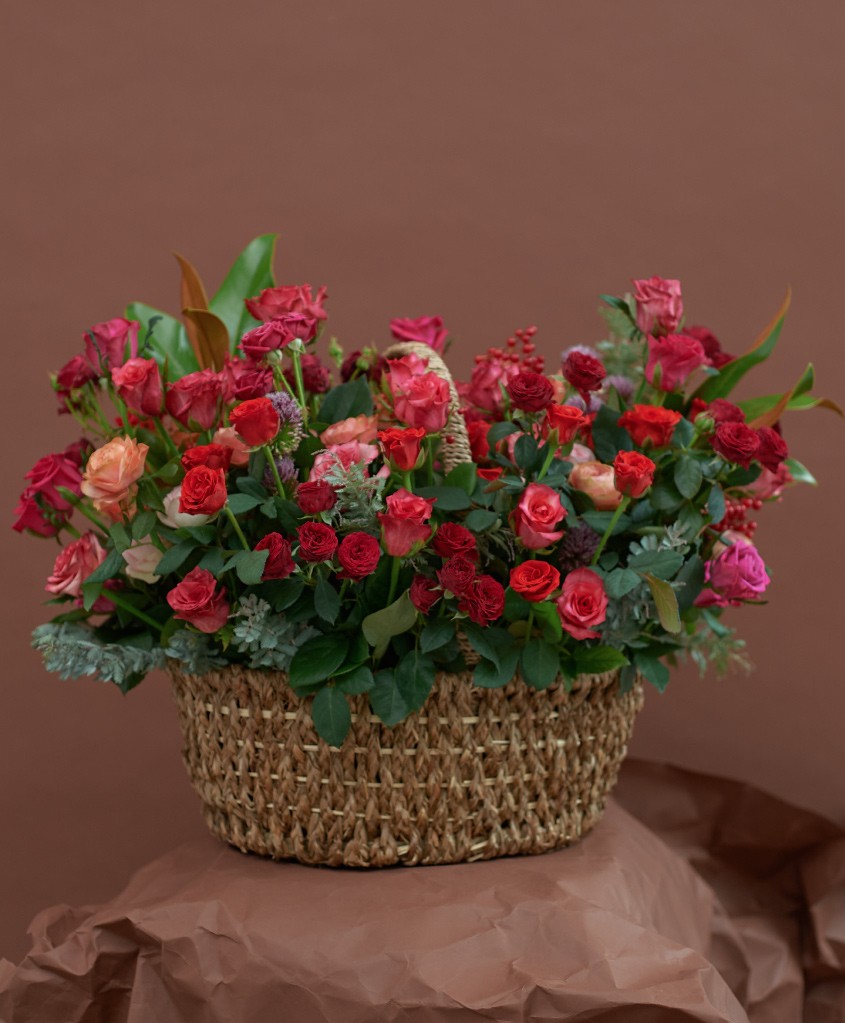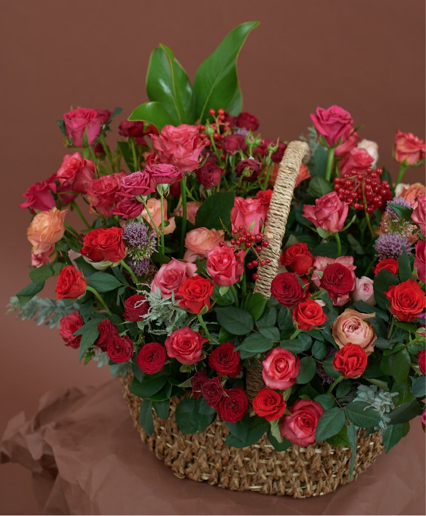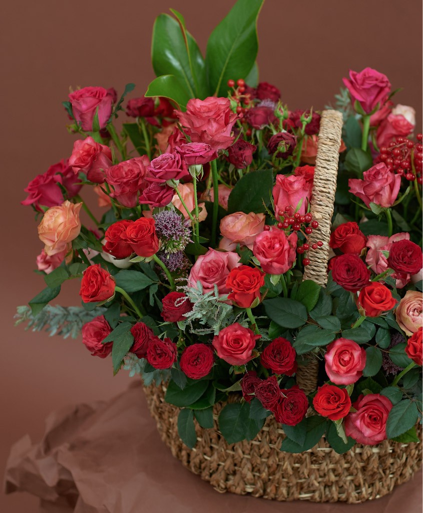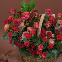 Корзина с ручкой размер XL, розы одноголовые и кустовые и сезонная зелень.