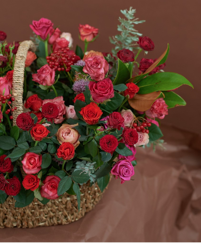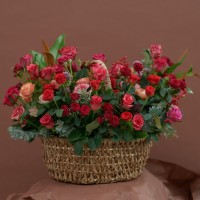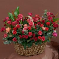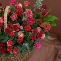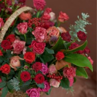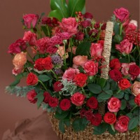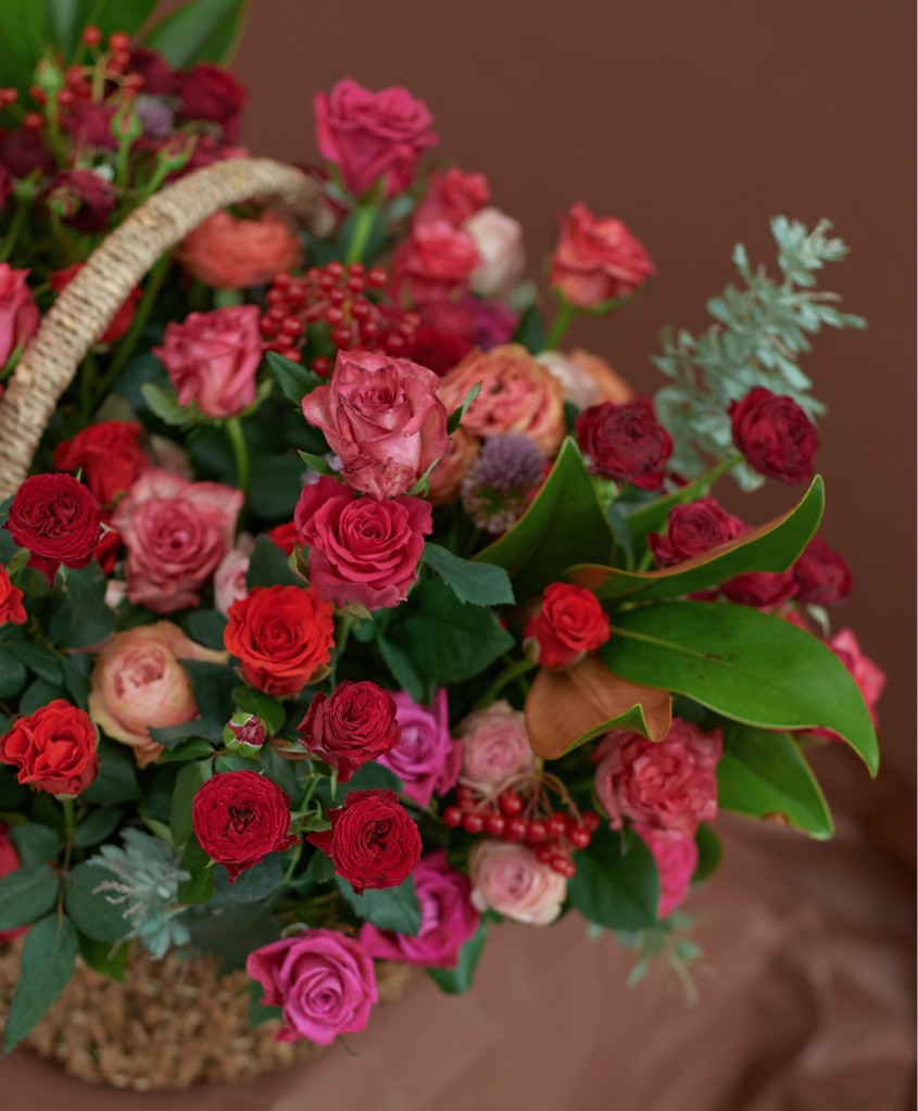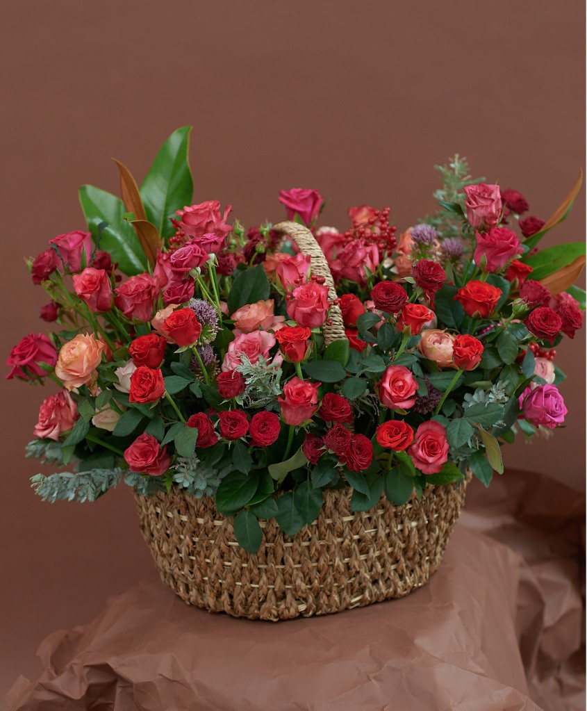 Корзина с ручкой размер XL, розы одноголовые и кустовые и сезонная зелень.
