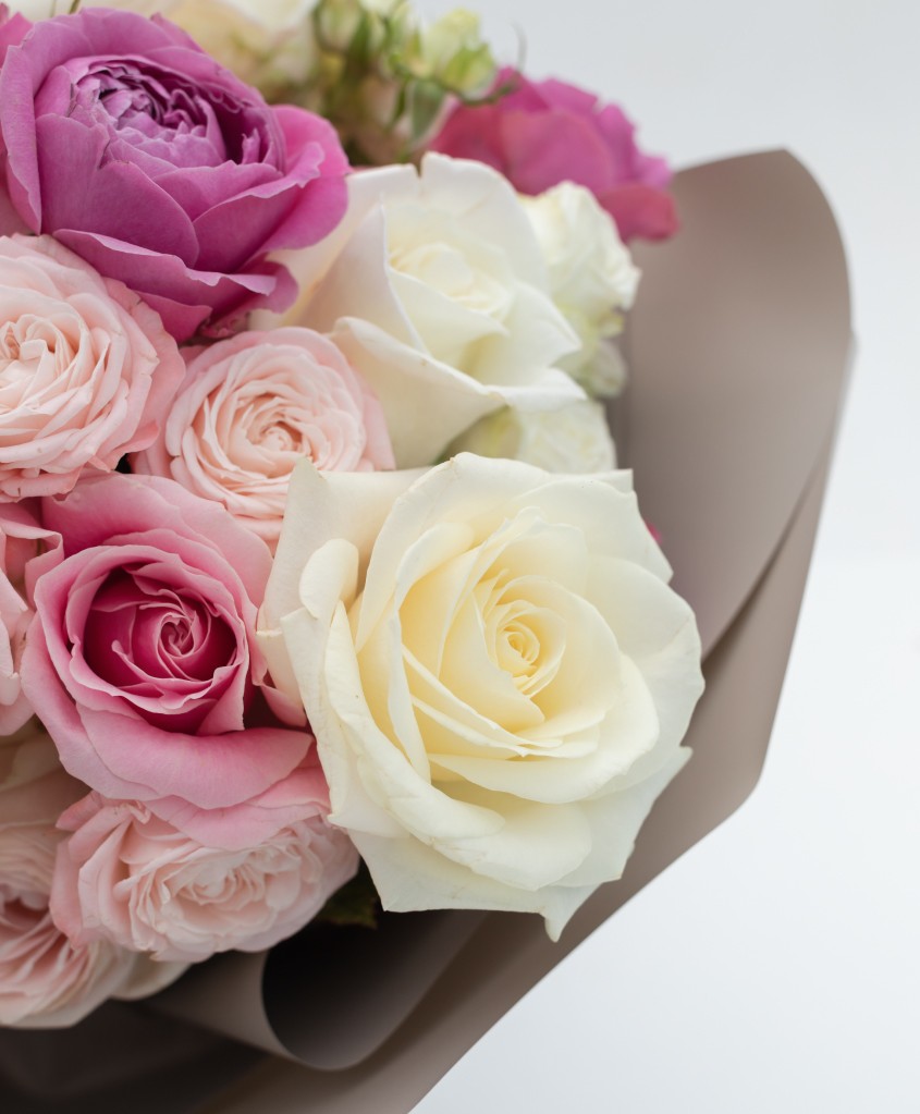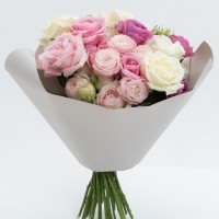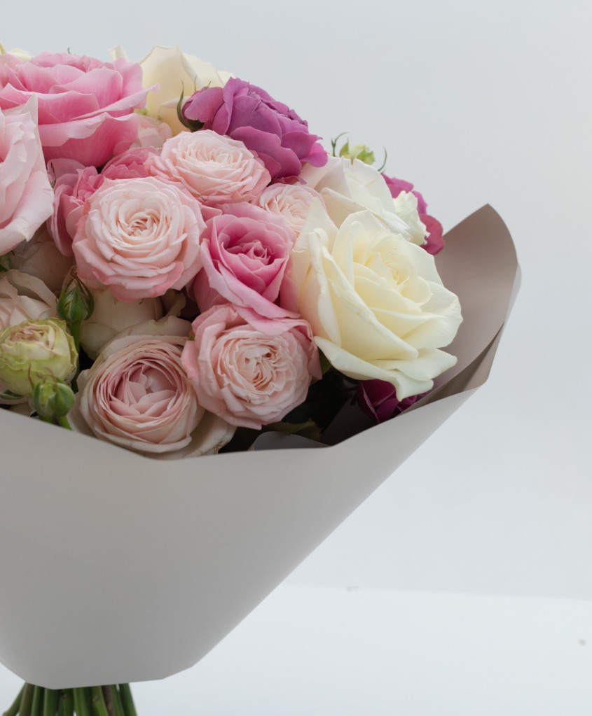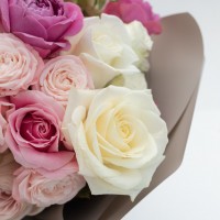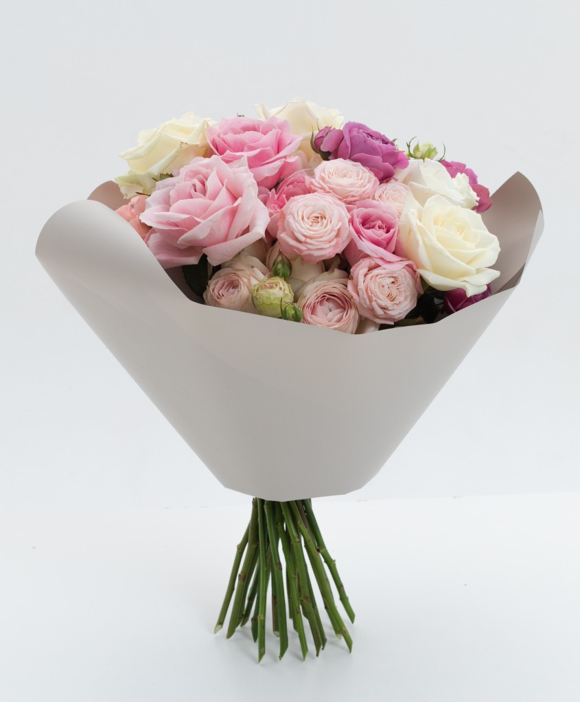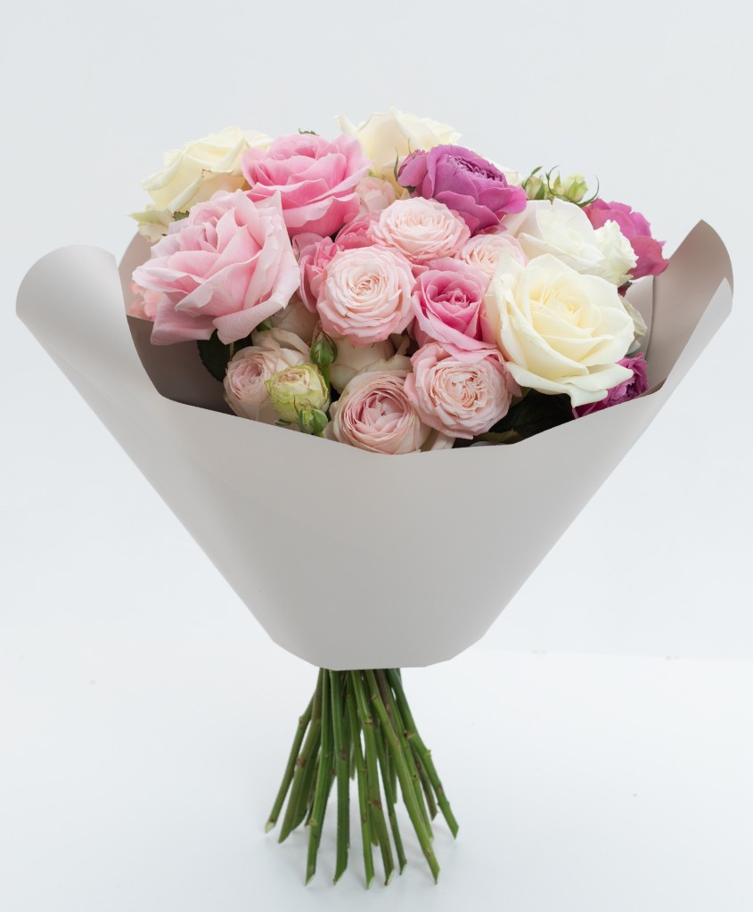Сборный букет в ярко-розовой гамме из 4х форм роз: кустовых, пионовидных, кустовых пионовидных и одноголовых.