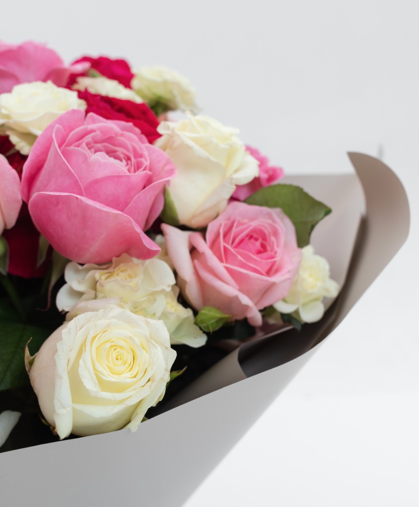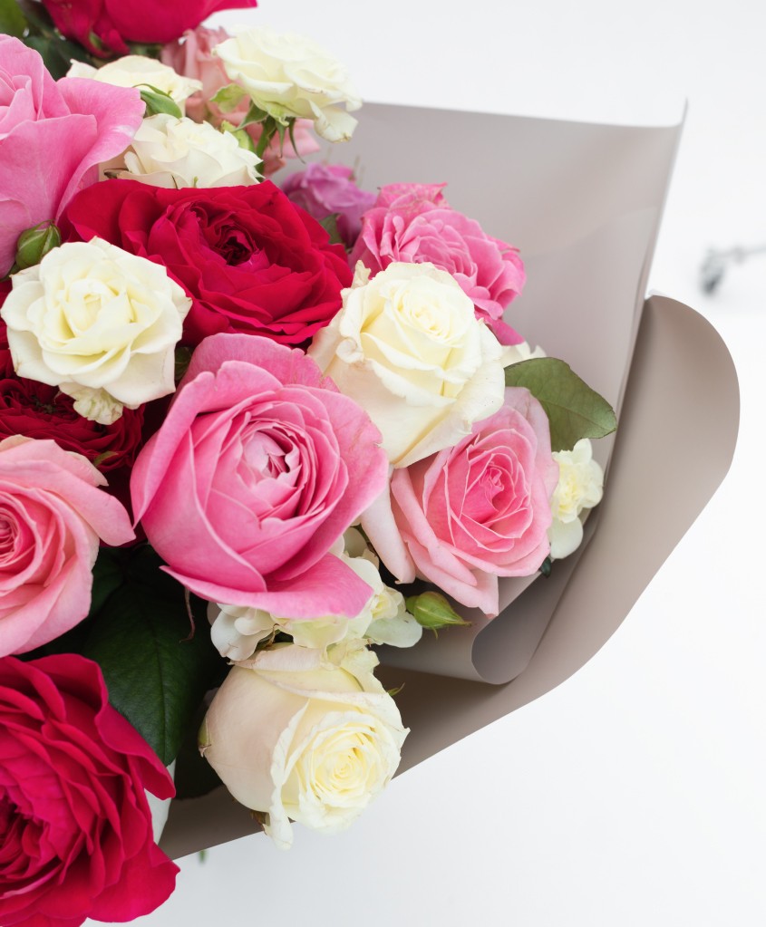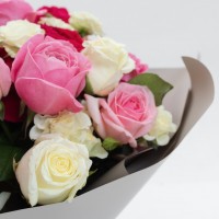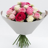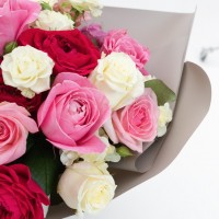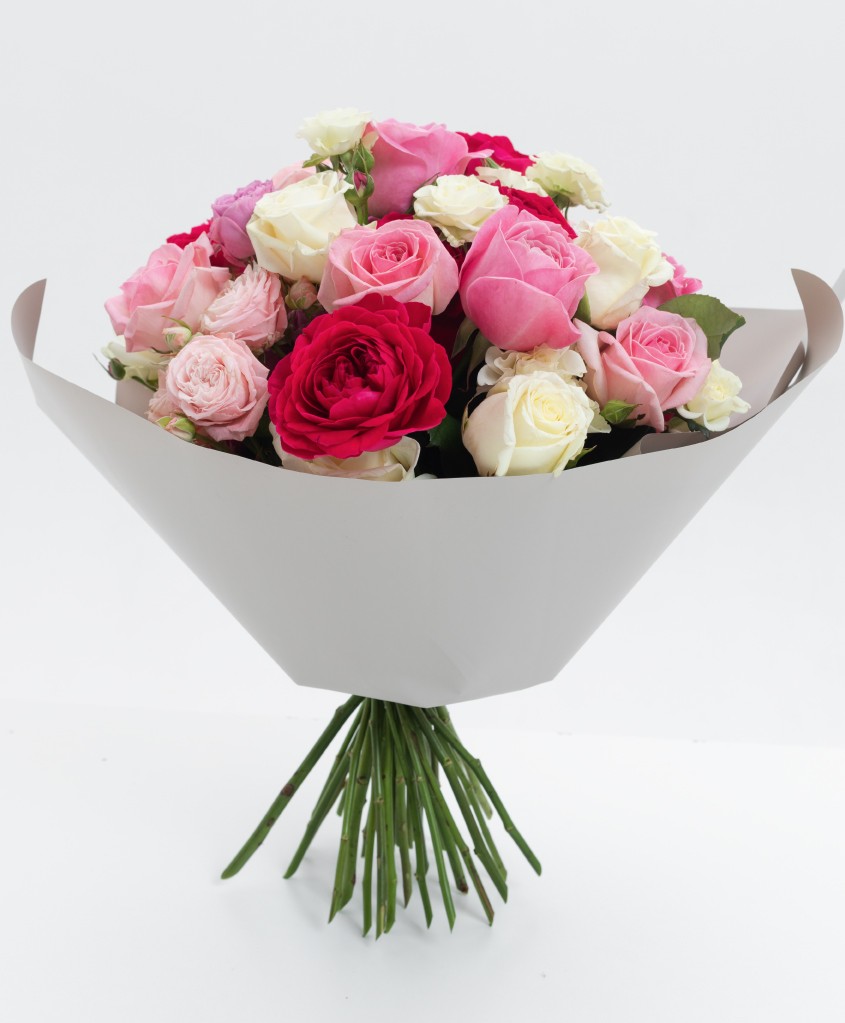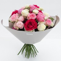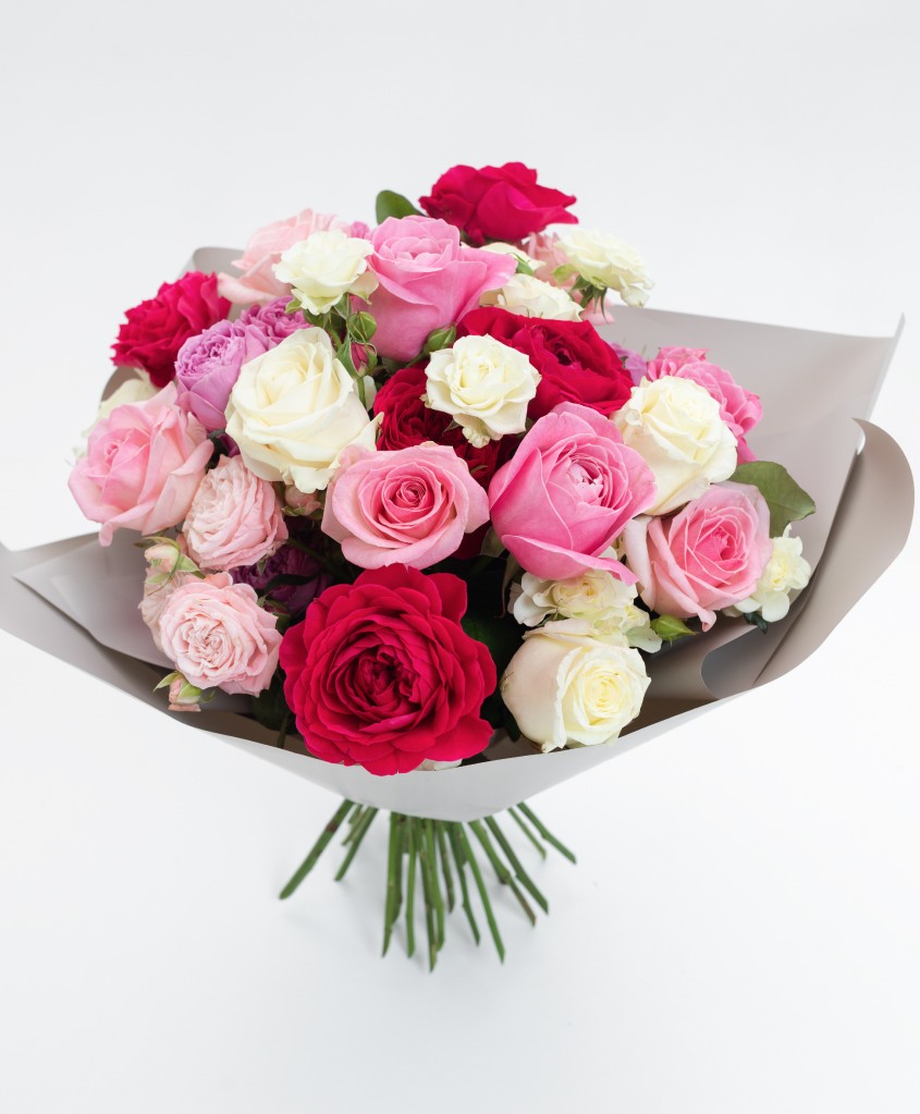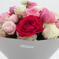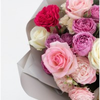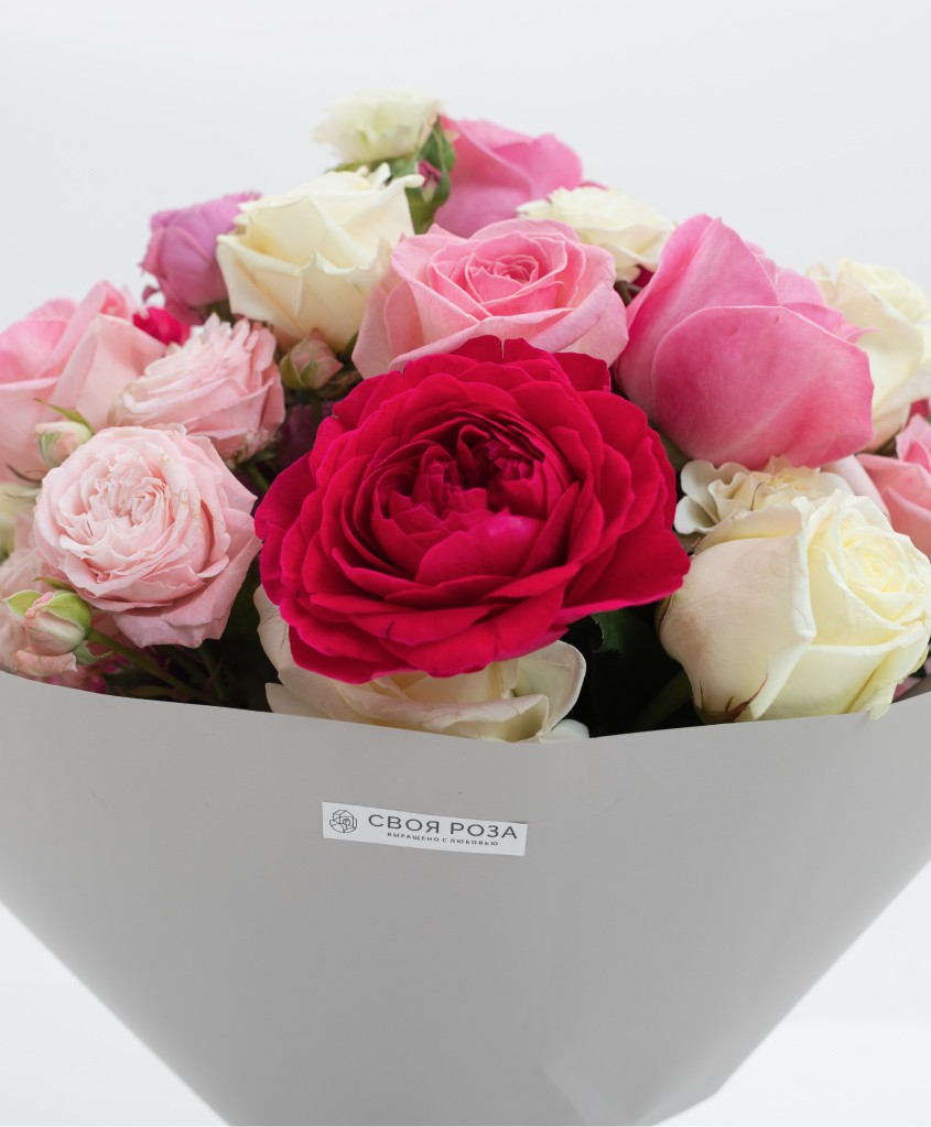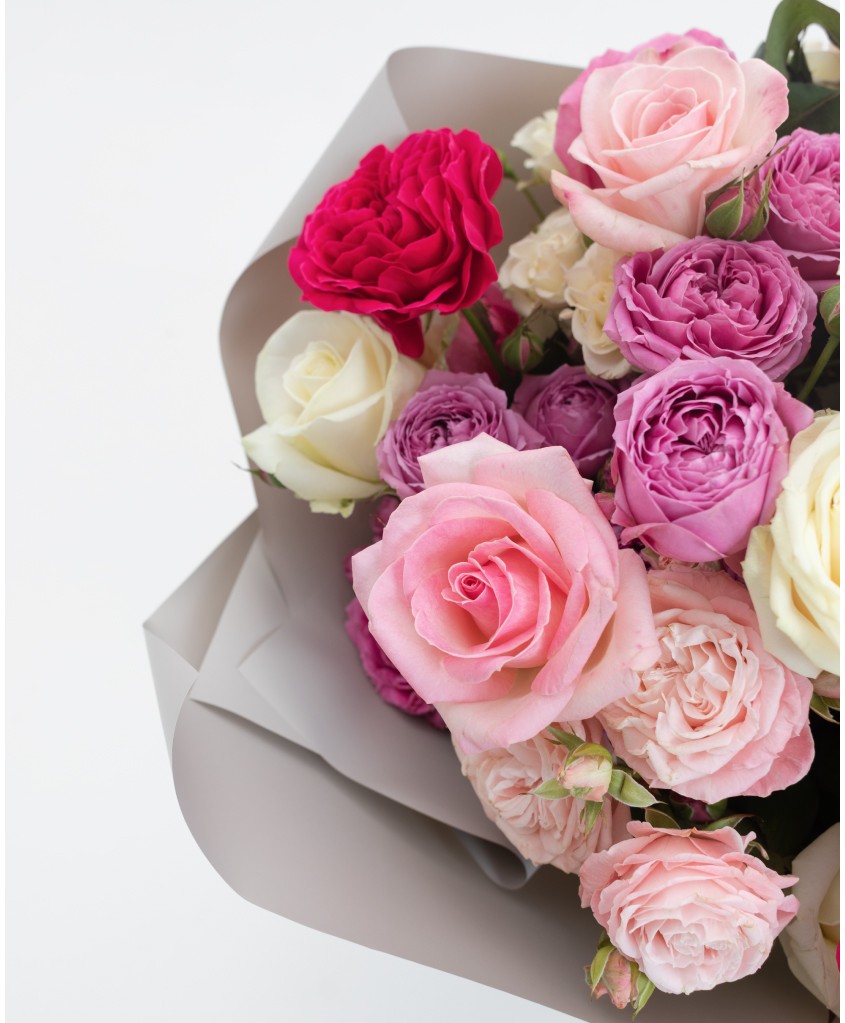Сборный букет в ярко-розовой цветовой гамме из 4х форм роз: кустовых, пионовидных, кустовых пионовидных и одноголовых.