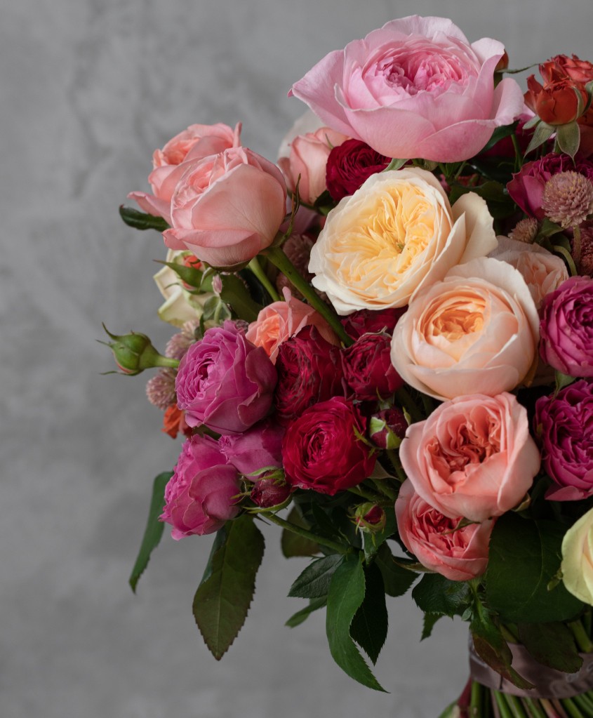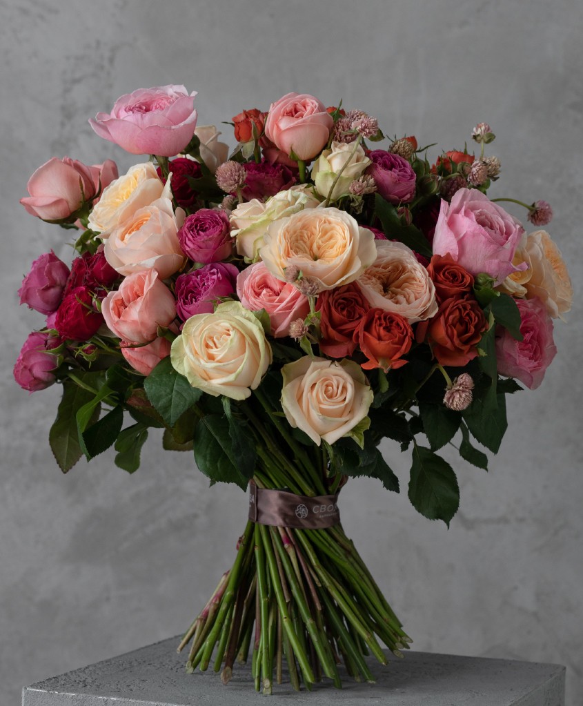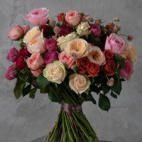 Сборный букет в розовой, ярко-розовой , персиковой гамме из 4х форм роз : кустовых, пионовидных, кустовых пионовидных и одноголовых.