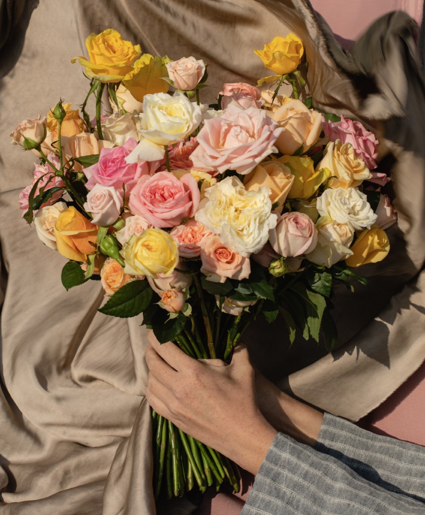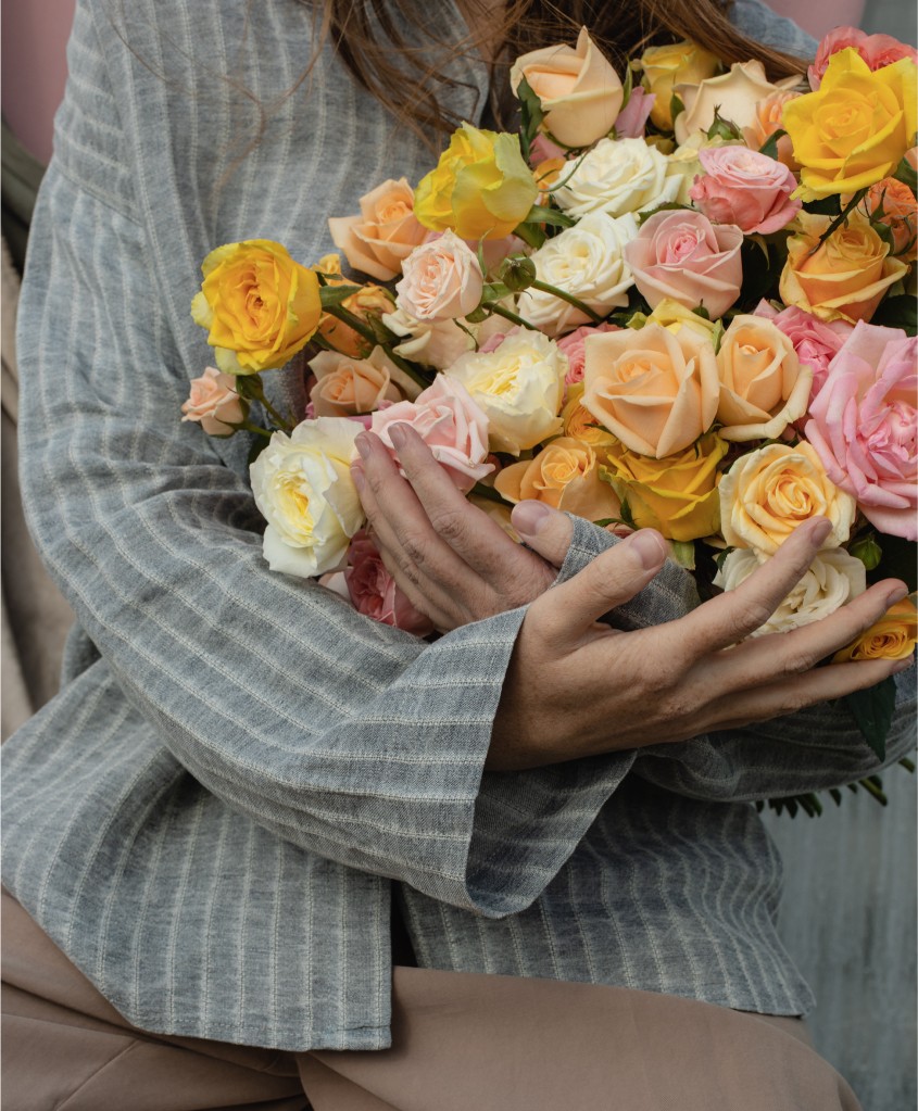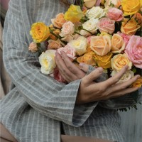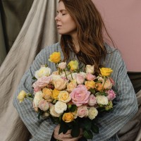 Сборный букет в розовой , желтой,, белой, кремовой гамме из 4х форм роз : кустовых, пионовидных, кустовых пионовидных и одноголовых.